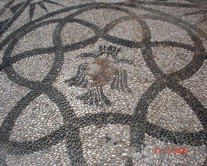 Στον εξωτερικό χώρο η καλλιτεχνική έκφραση του αρχιτέκτονα βρίσκει διέξοδο στην κατασκευή του δαπέδου της αυτής της εκκλησίας αφού πουθενά αλλού δεν επιτρεπόταν να εμφανιστεί η διαφορά της πολιτισμικής μα και της θρησκευτικής καλλιτεχνικής ιδιοσυγκρασίας των μειονοτήτων στο χώρο την εποχή εκείνη. Έτσι τα «βολάκια», τα σχήματα και οι συνθέσεις, δίνουν την δυνατότητα στο καλλιτέχνη να περάσει τη λεπτή αισθητική της σύνθεσης και της ταυτότητας με τα πιο λαϊκά υλικά. Ροζέτες και πεντάλφα, βυζαντινοί αετοί με στέμμα, τρίγωνα, ρόμβοι, ήλιοι, καμπύλες και ευθείες αρμονικά δεμένες γεμίζουν τα τεράστια κομμάτια σε όλο το μήκος και το πλάτος του αυλόγυρου.