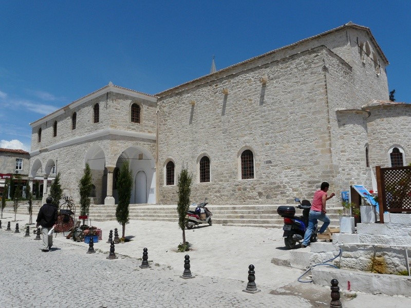 * «Το 1833, τότε που η τουρκική κυβέρνηση ήταν πιο ανεκτική προς τους χριστιανού των δυτικών παραλίων της Μικράς Ασίας χάρη της τροπής των πραγμάτων μετά την υπογραφή της Συνθήκης της Αδριανουπόλεως του 1829, κατεδαφίζεται και οικοδομείται από τον Αρχιτέκτονα Ε. Καλονάρη ευρύτερος και ευπρεπέστερος ναός από τον προηγούμενο στο όνομα των Εισοδίων της Θεοτόκου. Είναι ρυθμός παλαιάς βασιλικής, επιμήκης, ορθογώνιος χωρίς θόλο, κεραμοσκεπής, διαιρούμενος από διπλή σειρά δώδεκα μονόλιθων μαρμάρινων κιόνων εις τρία κλίτη, στοές, στεγαζόμενος από θολωτή στέγη και με πρόθυρο στοά μαρμάρινη μετά κιόνων στην πρόσοψη, νάρθηκας. Πάνω από τη στοά της πρόσοψης και κάτω από έναν βυζαντινό δικέφαλο αετό ήταν η επιγραφή: