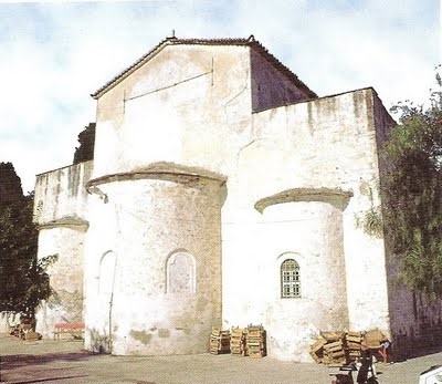 Τη μέρα που ήθελε να αρχίσει ο εργολάβος τα θεμέλια μαζεύτηκε όλο το χωριό να σκάψει για να κατεβάσουνε το χώμα. Η εκκλησία έγινε χαμηλά γιατί δεν έπρεπε να ξεπεράσει στο ύψος το τζαμί. Είχε έξη εφτά σκαλιά για να τα κατέβεις και να μπεις μέσα και ένα γύρω είχε αυλότοιχο δυόμιση με τρία μέτρα ψηλός. Είχε και δυο αυλόπορτες μια από τα βόρεια και μια από το νοτιά. Γύρω-γύρω στον τοίχο ήτανε κυπαρίσσια θεόρατα και στην αυλή της ήταν πέτρες της θάλασσας, βολάκια, που κάνανε πολλά σχέδια σε μεγάλα κομμάτια του περίβολου. Από την κεντρική πόρτα κατέβαινες τα σκαλιά και έμπαινες μέσα στη εκκλησία. Μπροστά ήτανε ο Νάρθηκας με κολώνες και τόξα.