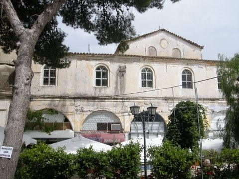 Εις το προς βορρά τμήμα του περιβόλου υπήρχε διώροφο και ευρύχωρο οικοδόμημα που χρησιμοποιήτο για τις συνεδριάσεις της κοινότητος, την στέγαση των γραφείων της Δημογεροντίας και των άλλων κοινοτικών ιδρυμάτων και υπηρεσιών καθώς και ξενώνας παραμονής του Αρχιερέως κατά τις επισκέψεις του στην πόλη, γι αυτό και το κτήριο ονομάζετο Μητρόπολη. Στο οικοδόμημα αυτό είχε κτιστεί και κωδωνοστάσιο, απομίμηση σε μικρογραφία του πολύ-όροφου κωδωνοστασίου της εκκλησίας της Αγίας Φωτεινής της Σμύρνης, με ρολόι που κτυπούσε τις ώρες της ημέρας. Αυτό το οικοδόμημα έπεσε και καταστράφηκε στους σεισμούς του 1883.»