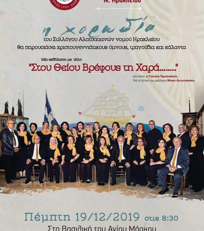 Η χορωδία του Συλλόγου Αλατσατιανών Νομού Ηρακλείου θα παρουσιάσει χριστουγεννιάτικους ύμνους, τραγούδια και κάλαντα.