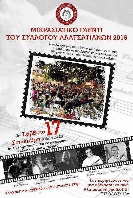 Ο Σύλλογος Αλατσατιανών Ν. Ηρακλείου, σας καλεί στο γλέντι της πλατείας μας το Σάββατο 17 Σεπτεμβρίου, (με ώρα έναρξης στις 20:30) στην πλατεία Ν. Αλατσάτων δίπλα στην στέγη του συλλόγου μας.